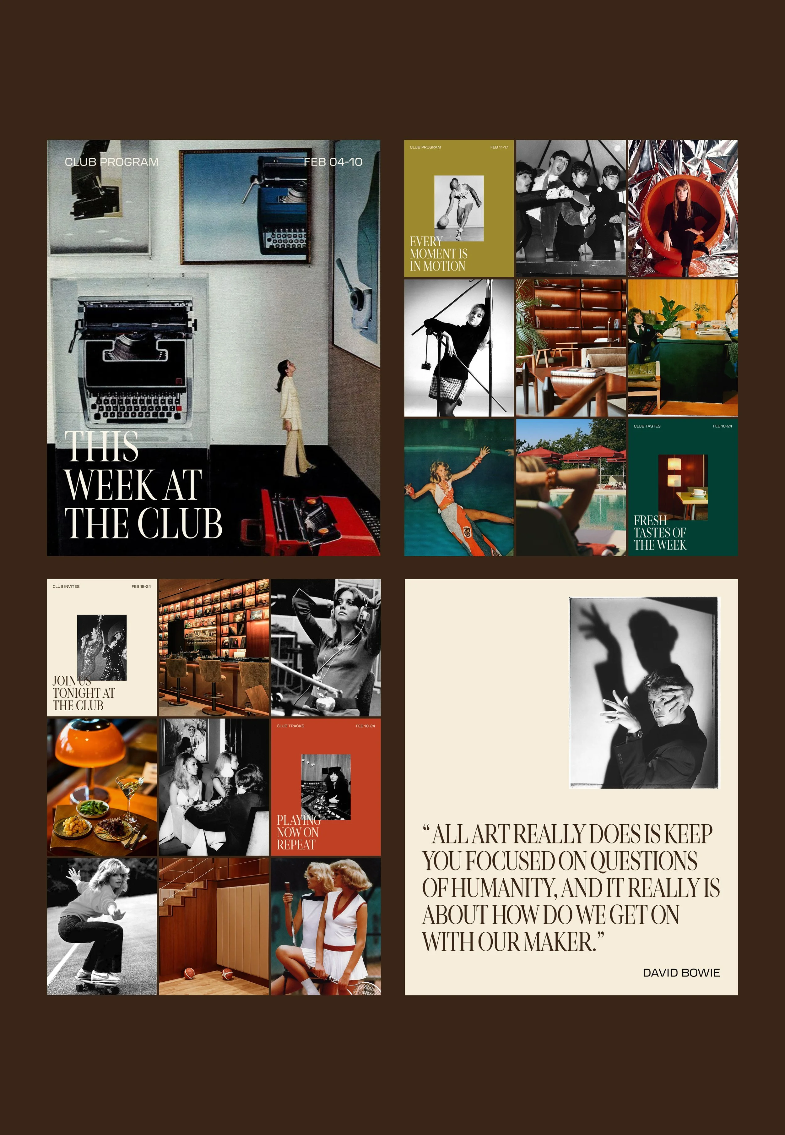 A new members club wanted a brand world to welcome its community into a vibrant space of culture, creativity, and movement. A house for the curious - Clubhouse meets the nostalgia of the classic ‘social club’ with a diverse and dynamic global perspective of today, presenting a lineup of programming in art, design, literature, film, music, sports, gastronomy, and wellbeing.